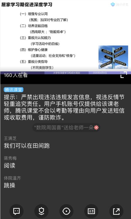 朱林副书记以《大学生居家学习期的深度学习和成长规划》为主题,以“居家学习期的深度学习”和“生涯发展的自我教育”为主线,对居家学习期的大学生就促进深度学习给出五点建议:一是增加专业认同;二是培养坚毅品格;三是重视元认知能力;四是维护身心健康;五是重视分类指导。接着,通过引入“职业生涯”和“职业生涯发展教育”这两个概念,引导学生从“认识自我”和“认识职业”达到内外部认知的统一,达到知己知彼的状态后再制定自己的决策行动。讲座结束后,朱林副书记针对学生提问进行了在线答疑,学生积极性高,互动效果良好。