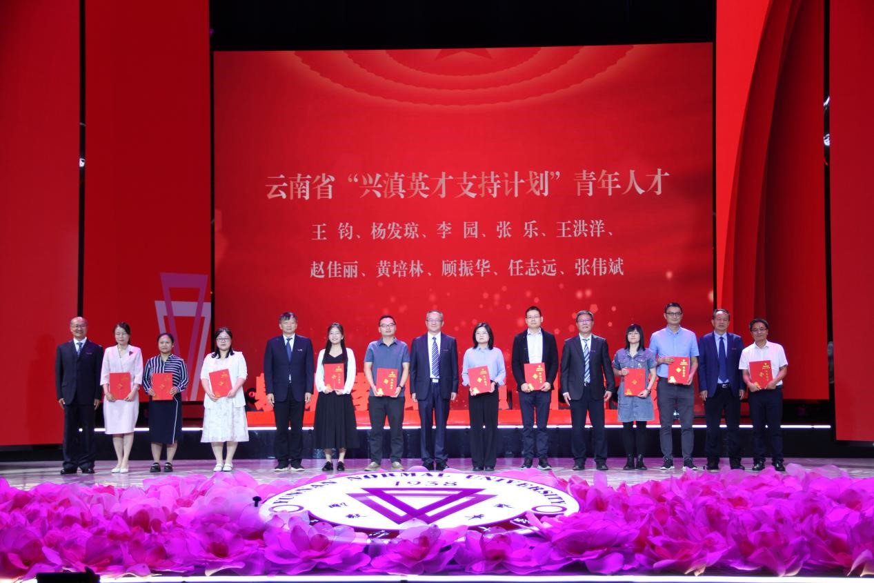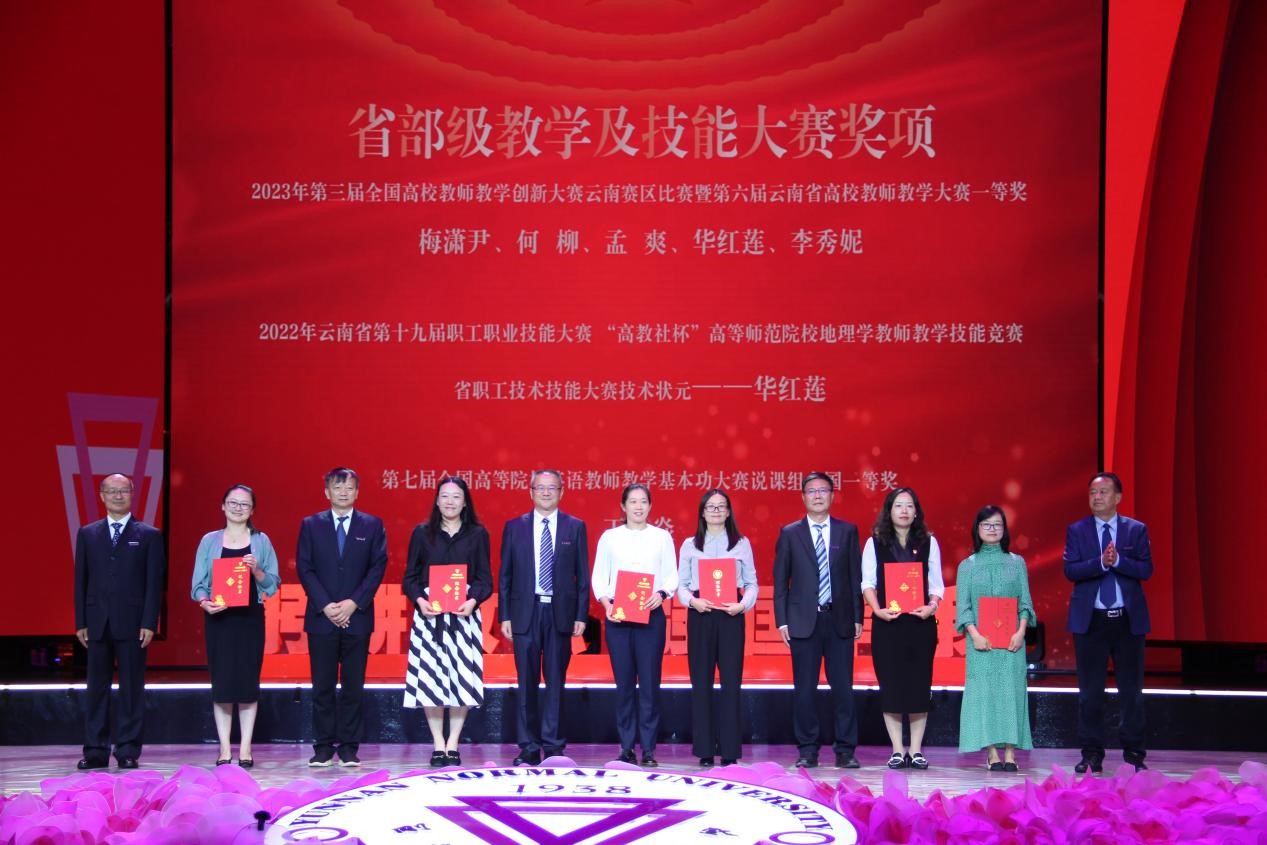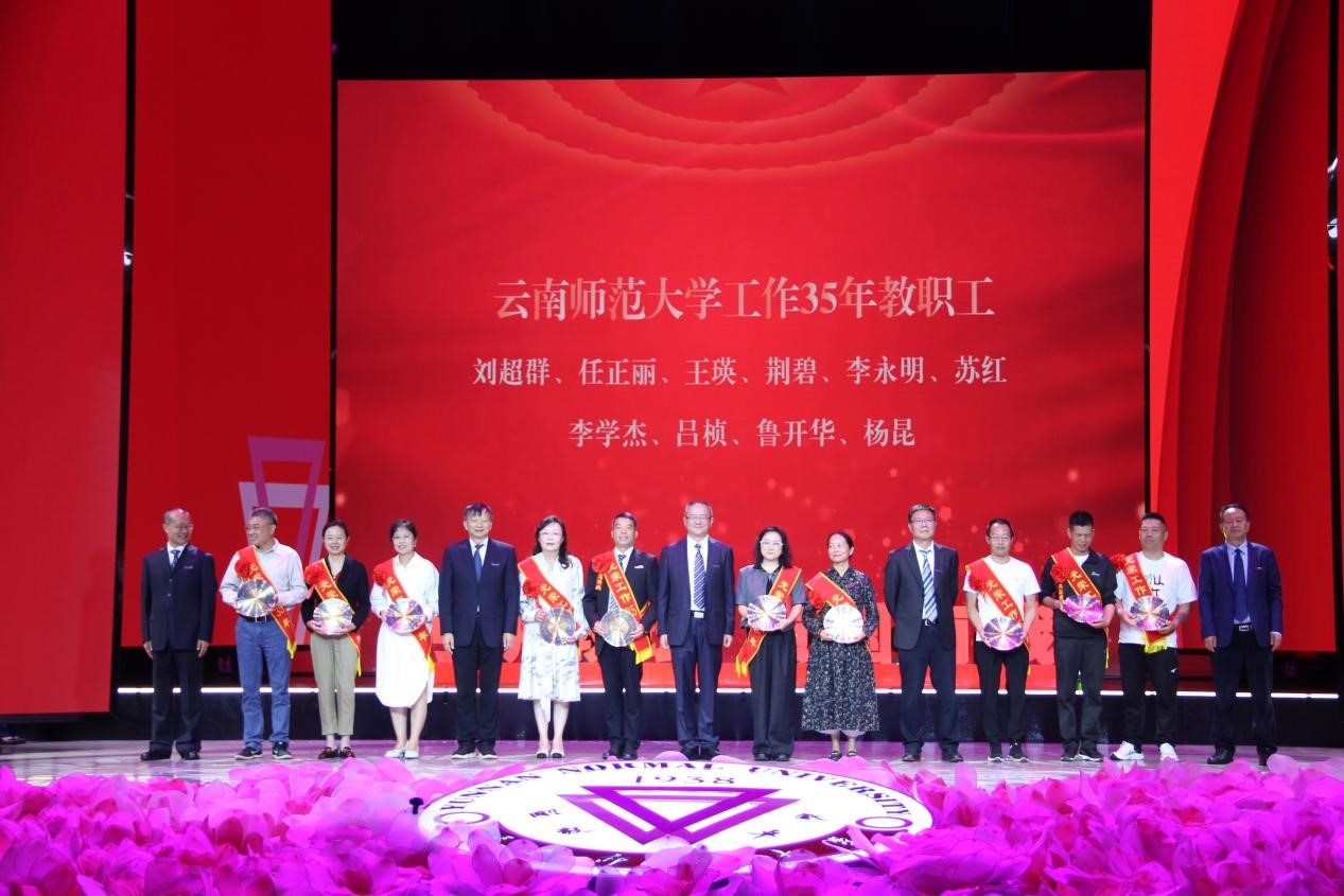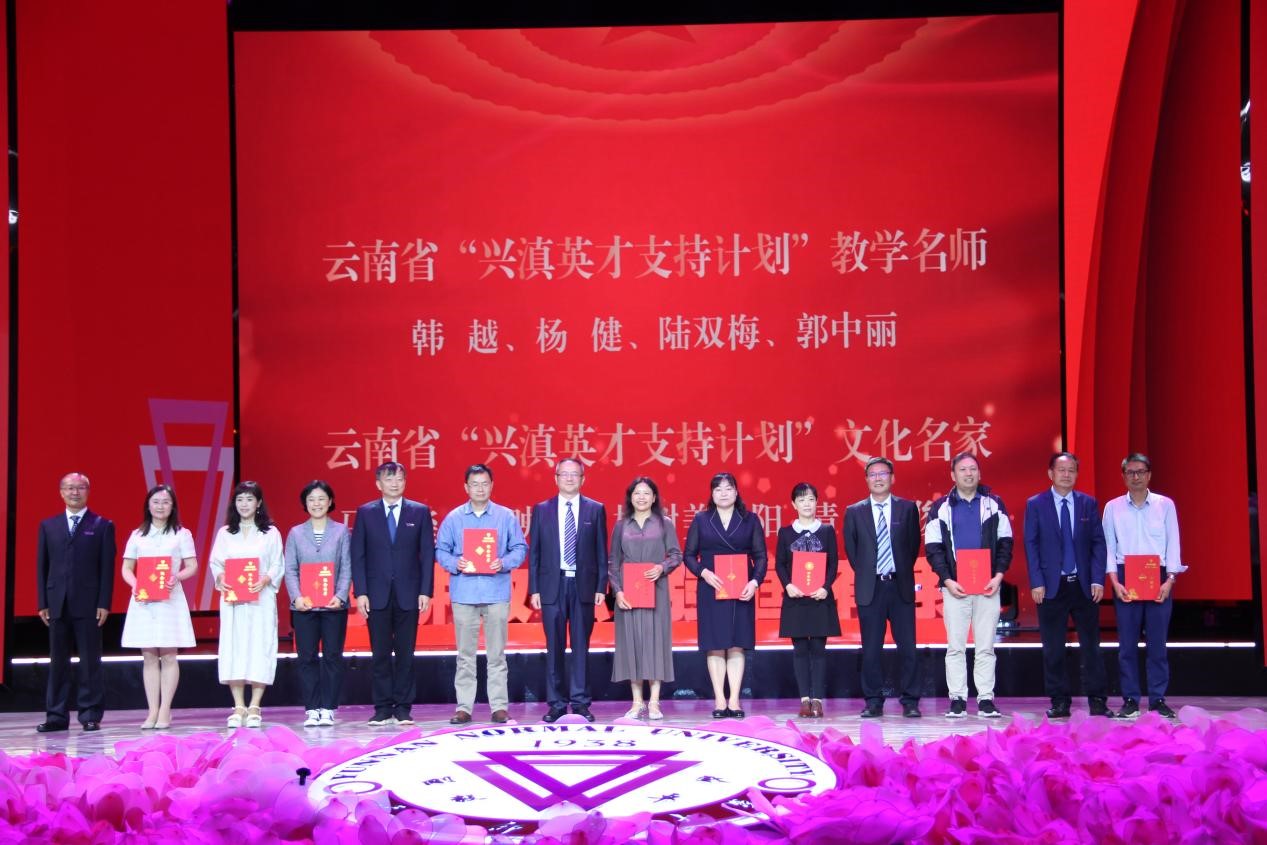 在激越的乐曲声中,会议对过去一年获得国家级荣誉及奖项的团队和教师代表,获得省部级荣誉及奖项的团队和教师代表,获云南省“兴滇英才支持计划”青年人才、教学名师、文化名家教师代表进行表彰,对在yL23411永利官网登录光荣工作35年的教职工颁发荣誉纪念盘。