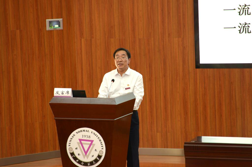 会议最后,校党委书记饶卫作了题为《建设一流师范本科 当好教师教育排头兵 加快建设教师教育为特色的高水平大学》的讲话。饶书记强调,全面振兴云南教师教育、全面提升云南基础教育质量、实现云南教育现代化,云南师大肩负重大责任。学校必须贯彻落实省委省政府决策部署,加快推进以教师教育为核心的综合改革,加快建设一流师范,当好云南教师教育排头兵。在综合分析全国全省教师教育改革发展形势,结合学校80年办学的基础上,饶书记提出了三个方面具体要求:一是加强党对本科教育工作的全面领导,坚持不懈地把“四个服务”作为办学治校的根本指南,以立德树人成效作为检验学校一切工作的根本标准,把思想政治工作贯穿到学科体系、教学体系、教材体系、管理体系等人才培养全方位、全过程、各环节;二是要锲而不舍地把强化教师教育特色作为学校深化综合改革的关键抓手,推动学校内涵式发展,推进“双一流”和高水平大学建设;三是要加快健全教师教育人才培养体系,为解决云南基础教育“人才饥荒”问题积极担当作为。最后,饶书记希望全校师生深入学习贯彻全国、全省教育大会精神,全面加快建设一流本科、一流师范、一流专业、一流课程,当好教师教育排头兵,建设教师教育为特色的高水平大学,为服务云南高质量跨越式发展、全面建成小康社会作出新的更大贡献,以优异的成绩迎接中华人民共和国成立70周年华诞的到来。
