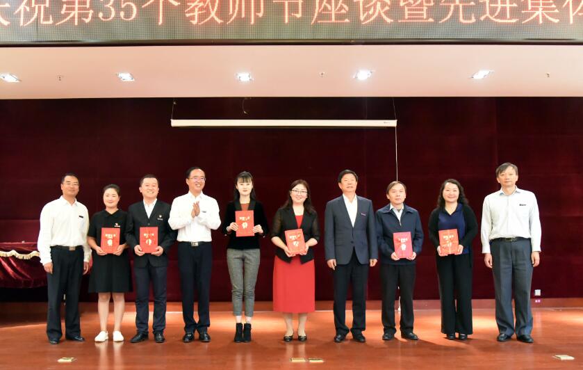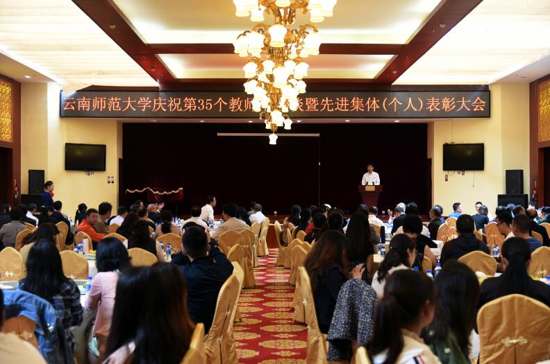 金秋九月、桃李满园,在第35个教师节带来之际,9月10日上午,yL23411永利官网登录庆祝第35个教师节座谈暨表彰大会在呈贡主校区启园一食堂举行。校党政领导班子成员,其他省管干部,部分离退休老领导,高层次人才代表,各学院教师代表,从教35年教师代表,各部门教工代表,附属中小学及独立学院教师代表,2018-2019年度国家级、省级各类重大奖项、科研平台及项目获得者,离退休教师代表,各民主党派代表,学生代表,万名校长培训班学员代表等200余人参加了大会。大会由校党委副书记张玮主持。