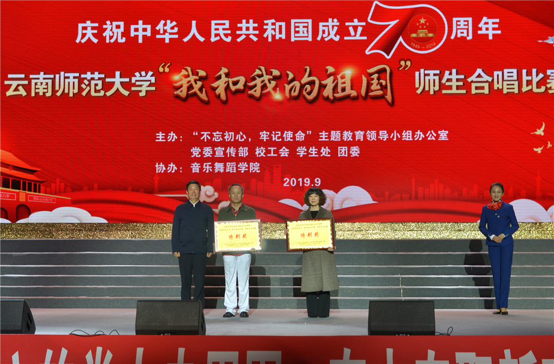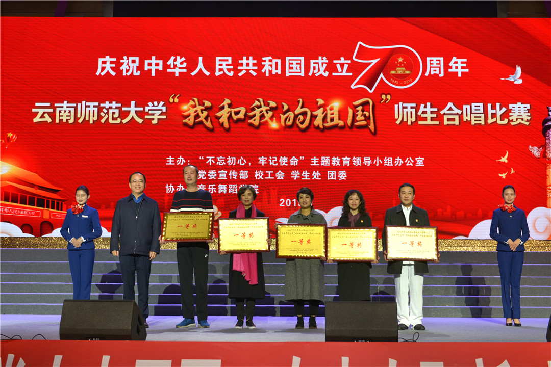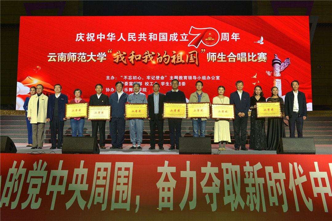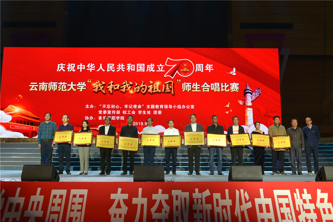 一首歌的时间,很短,唱不完心中所有对祖国的崇敬与爱恋;一首歌的时间,也很长,它流传在百姓的口中、心里,构成了一个时代最真实的倾诉。通过现场评委打分,最终,音乐舞蹈学院党委,离退休工作处党总支荣获特别奖;yL23411永利官网登录附属小学党委、云南省“万名校长培训计划”第三期学员、yL23411永利官网登录实验中学党委、机关党委、云南民族中学党委荣获一等奖;yL23411永利官网登录附属世纪金源学校党委等7家单位获得二等奖;校医院直属党支部、后勤保障服务中心党总支等11家单位获得三等奖。校领导上台为获奖单位颁奖并合影留念。