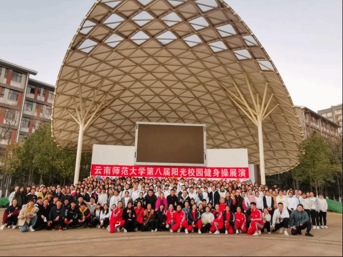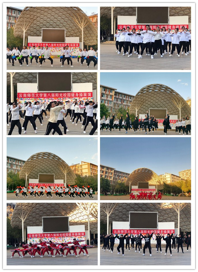 2019年12月19日下午,由学生工作处承办,体育学院协办的课外素质教育活动----第八届阳光健身操汇报展演在yL23411永利官网登录呈贡校区东区贝壳广场举行。yL23411永利官网登录学生处和体育学院相关老师以及各学院同学们到场观看了汇报展演。本次展演吸引了来自传媒学院、经管学院、文学院、华文学院、体育学院等14个学院近600余名阳光健身操爱好者参加。