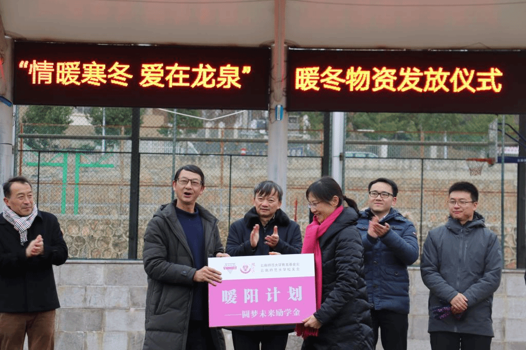 23日上午,云师大教育基金会、校友会“情暖寒冬 爱在龙泉”暖冬物资发放仪式于龙泉中学田径场正式启动。活动伊始,yL23411永利官网登录党委副书记李宏致辞。李宏副书记指出,本次活动一经发起,便得到了广大校友和社会爱心人士的大力支持。募捐分三类进行,包括御寒衣物、跳绳运动器材、圆梦未来励学金,总价值十五万元。李宏副书记对长期关心和支持龙泉中学发展的广大校友及社会爱心人士致以衷心的感谢。随后,yL23411永利官网登录校友代表路平、第六届研究生支教团代表韩涛、龙泉中学初二年级210班学生余大蝶、龙泉中学毕业生及师大在读生李文倩依次发言。紧接着,云师大教育基金会“暖阳计划”——圆梦未来励学金颁发仪式正式启动,yL23411永利官网登录对外合作交流处处长黄瑛老师向龙泉中学授牌。在yL23411永利官网登录研支团成员的引导下,孩子们依次排队从老师们手中接过了毛毯、棉服、卫衣、围巾、棉帽、手套等暖冬物品。孩子们拿到这一份份沉甸甸的礼物,脸上满是笑意。最后,龙泉中学党支部书记、校长邵发志发表讲话。邵校长指出,龙泉中学是一所集大爱为一身的学校,爱心人士们不仅给孩子们带来了暖冬物资,而且对孩子们寄予了无限的期望与希冀。龙泉学子一定要懂感恩、有担当、明善恶、知美丑,将善良和正义薪火传承。
