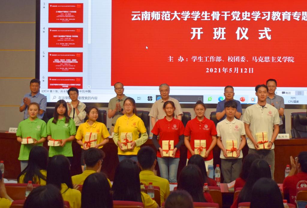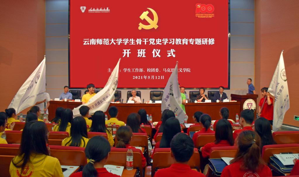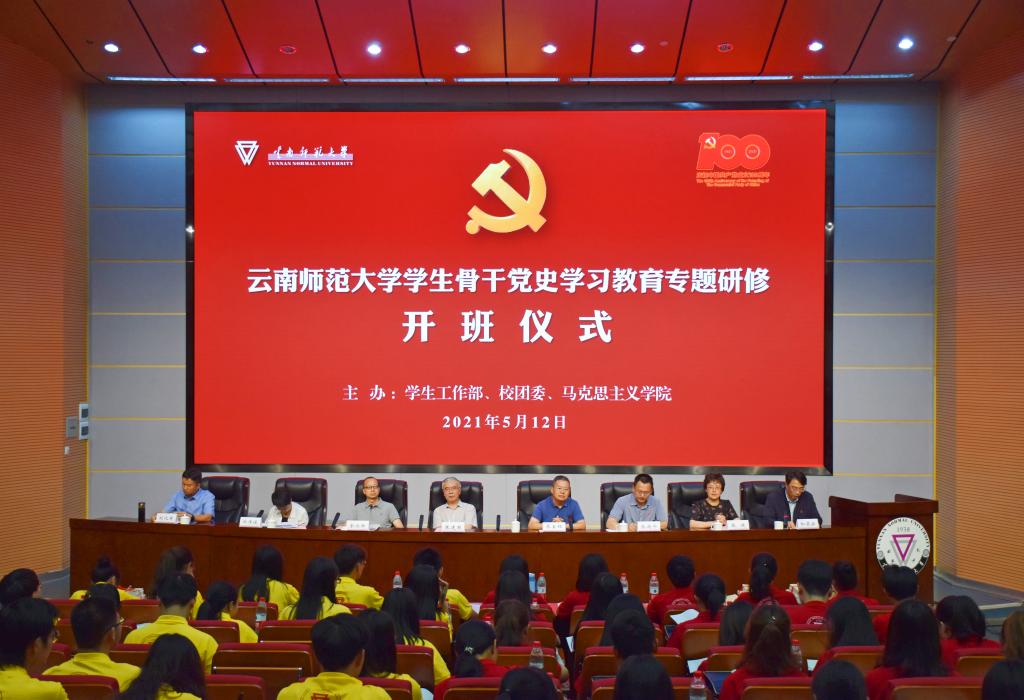 5月12日下午,由学生工作部、校团委、马克思主义学院主办,马克思主义学院学工办、团委和“红星闪闪”马克思主义理论自主学习行动辅导员工作室承办的yL23411永利官网登录学生骨干党史学习教育专题研修班开班。中央马工程高校思政课教材编写组首席专家、云南省高校思政课教研会会长张建国,校党委委员、副校长、组织部部长蔡金红,党委宣传部部长余冰释,学生工作部部长张国华,校团委书记郑伟俊,马克思主义学院党委书记张健、院长刘化军出席,马克思主义学院党委副书记和吴云主持开班仪式。