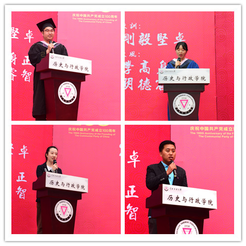 学院本科优秀毕业生代表2017级文物与博物馆学专业梁英旭同学和硕士优秀毕业生代表2018李铭同学依次上台发言,他们对母校及朝夕相处的老师同学们致以了最诚挚的感谢,并表达对未来的遥望与期许,中兴业,需人杰,每一位青年学子都应不断在人生道路上砥砺前行。在校生代表2018级历史学专业朱芮同学致欢送辞,表示毕业是结束,更是新的开始,祝福学长学姐们前程似锦,归来仍是少年。教师代表周鹏老师发言,以诙谐幽默的语言回顾了2021届毕业生难忘的经历,他指出大学生涯是人生最美好的时光之一,在今后的学习生活中,希望大家自强不息,弘扬和传承西南联大精神,厚德载物,汲取和涵养书中智慧养分。