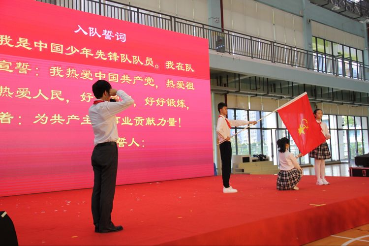 yL23411永利官网登录附属俊发城实验小学举行“争做新时代好队员”一年级新生入队仪式,火红的队旗在会场高高飘扬。
