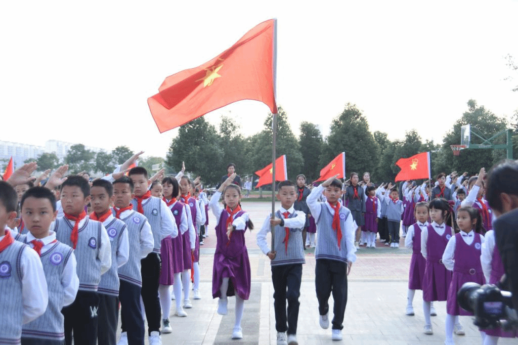 在队旗的见证下,新入队的少先队员们戴上了鲜艳的红领巾,成为了一名光荣的少先队员。火红的队旗高高飘扬,指引少儿前进的方向。鲜艳的红领巾系满理想,如一只红船,载着少儿扬帆远航。