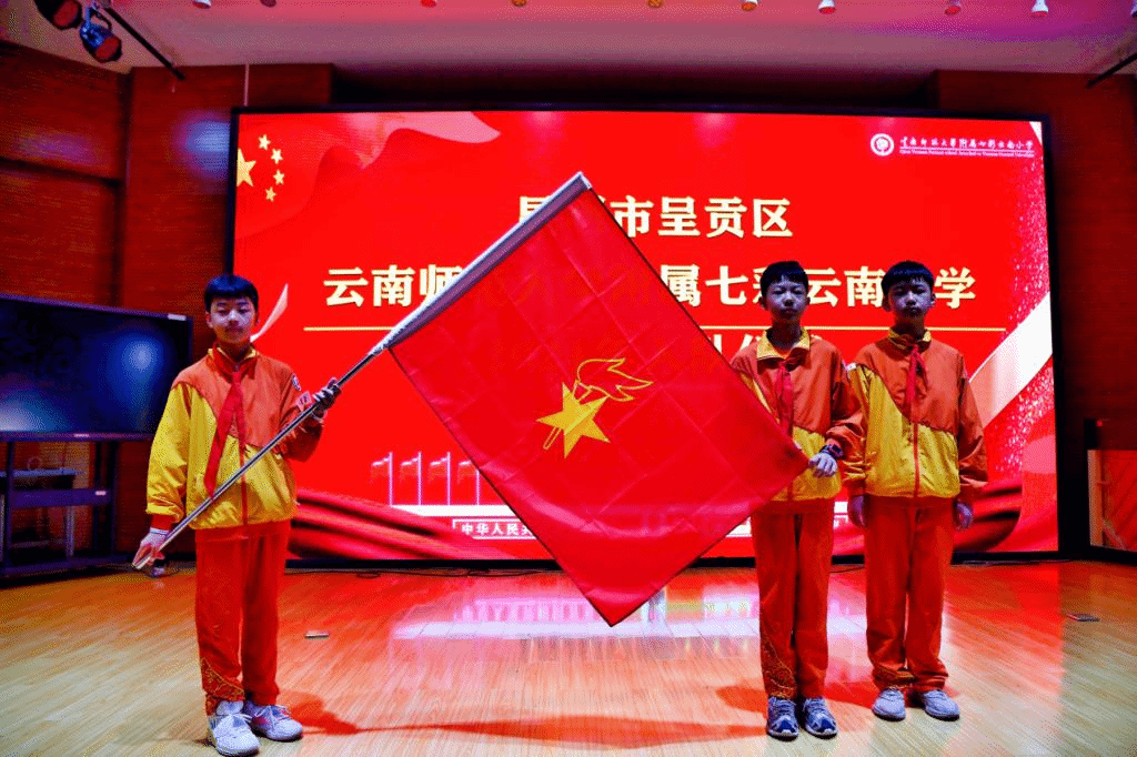 yL23411永利官网登录附属七彩云南小学新队员们在队旗下庄严宣誓、呼号,表达出他们的心声——“为共产主义事业而奋斗,时刻准备着!”