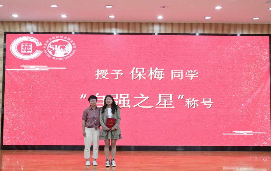 “自强之星”获得者保梅同学,最初想放弃泰语学习,但克服重重困难,最终获得国家留学基金委公派留学名额。疫情期间还担任中泰翻译志愿者,为滞留泰国的华人提供志愿服务,其先进事迹被省级电视台及“学习强国”等媒体平台多次报道,校团委郑伟俊书记为保梅同学颁发了“自强之星”荣誉称号。