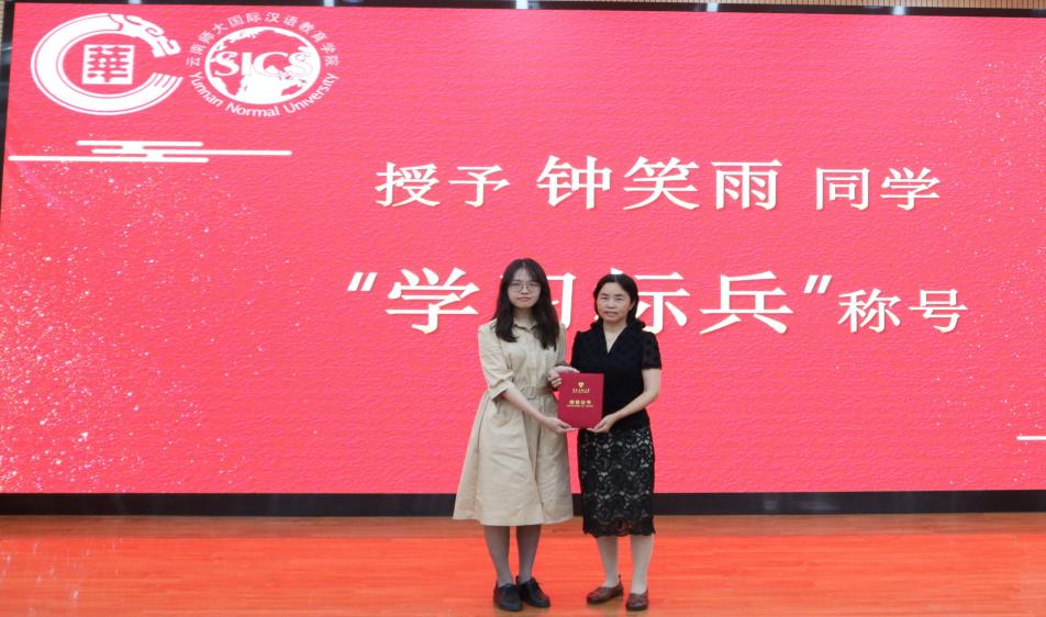 “学习标兵”钟笑雨用惜时、善思、笃志概括了四年大学生活。她获得过国家奖学金、多项省级和校级荣誉,发表学术论文,跨专业考研,用自己的努力践行着“天道酬勤,力耕不欺”这句名言,在同学中起到了很好的模范带头作用。云南华文学院常务副院长段洁云为她颁发“学习标兵”荣誉称号。