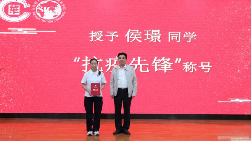 “抗疫先锋”获得者侯璟同学,学习刻苦、成绩优异,大学期间多次获得各种奖项。“青春志愿行,服务源于心”是她一直遵从的理念,2020年疫情突然来袭,她义无反顾投身参加抗疫、支教等志愿服务,获“云南省新冠肺炎疫情防控优秀志愿者”等省级表彰。云南华文学院院长王秀成为侯璟同学颁发了“抗疫先锋”荣誉称号。