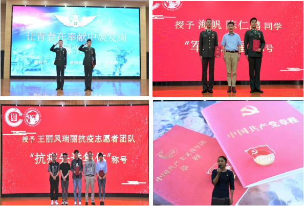 海帆和陈仁鹏积极参军入伍,在军营中磨砺自己,培养爱国情怀,砥砺强国之志,实践报国之行。云南华文学院副院长黄启庆为他们颁发“军旅之星”荣誉称号奖。瑞丽疫情突发,王丽凤老师及其抗疫团队在他们擅长的领域里发光发热,在中缅边境积极组织筹集物资、为当地政府、居民和缅甸友人提供缅语翻译服务。李正升主任为王丽凤老师及其抗疫团队颁发“抗疫先进个人”和“抗疫先进集体”荣誉称号。