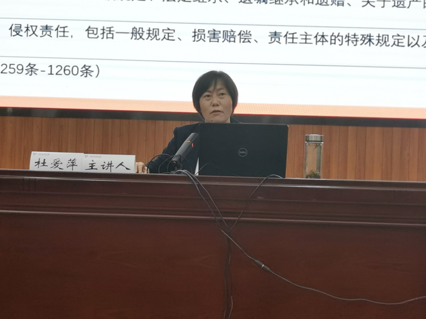 法学与社会学学院教授杜爱萍同志以“民法典视角下不动产物权的变动与保护实践”为主题,对《民法典》进行概要性讲述,结合生活中生动的案例为大家详细讲述了什么是不动产物权、不动产物权如何变更和保护等内容,引人深思。