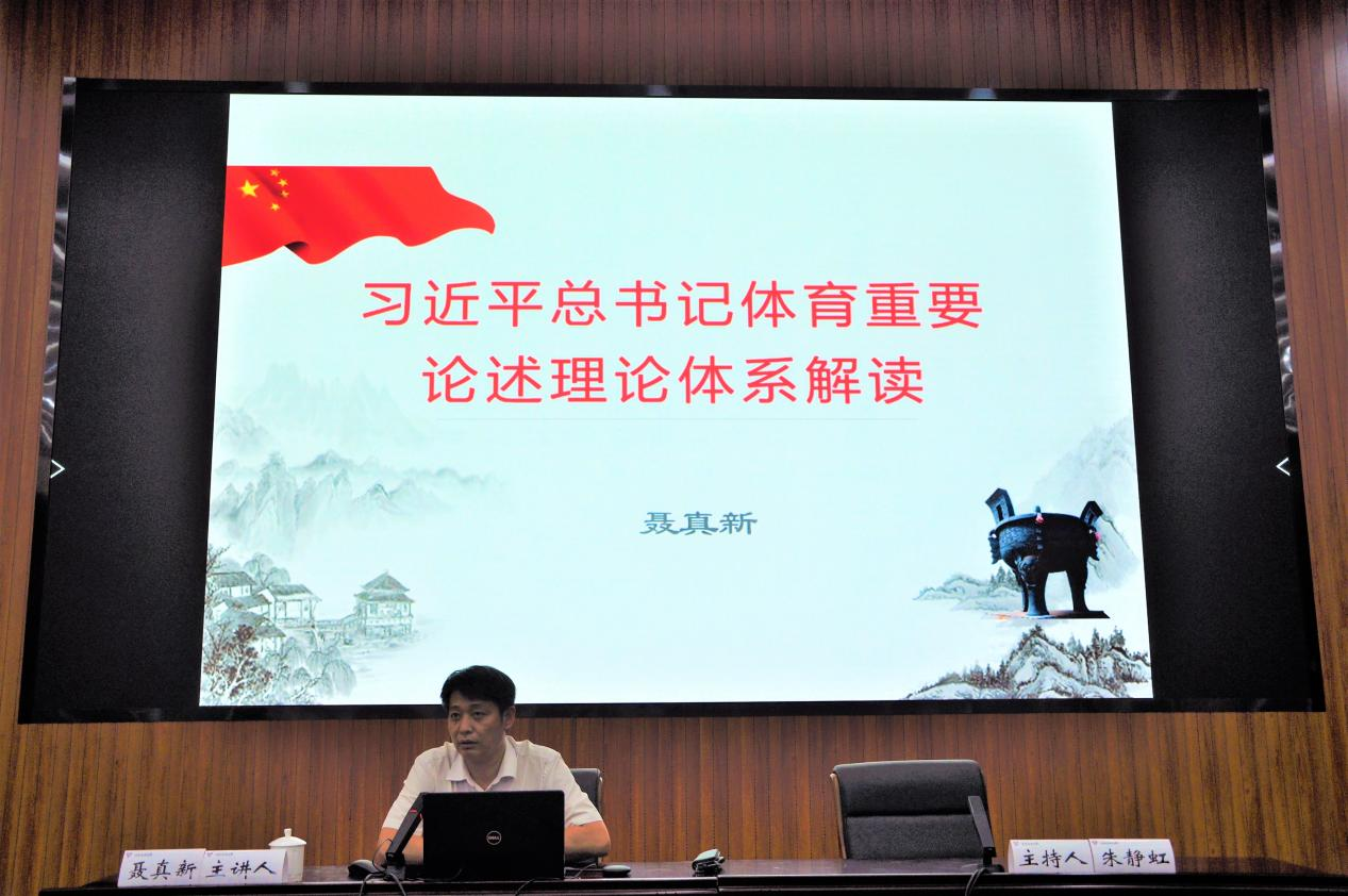 体育学院院长聂真新同志以“习近平总书记体育重要论述理论体系解读”为主题,结合目前中国人的健康状况,从一总纲、八要义、十要旨,详细解读习近平总书记关于体育的重要论述。