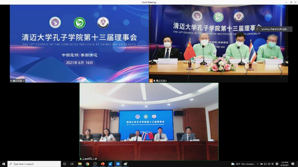2021年6月16日下午,清迈大学孔子学院第十三届理事会以网络视频会议方式在yL23411永利官网登录呈贡校区行政楼和清迈大学信息技术中心同步召开。yL23411永利官网登录校长蒋永文,副校长刘宗立,华文学院、对外合作交流处主要领导,清迈孔院中方院长沈毅作为中方理事参会;清迈大学校长尼维,副校长龙姆,清迈孔院泰方院长马如宝作为泰方理事参会。会议由yL23411永利官网登录副校长刘宗立主持。