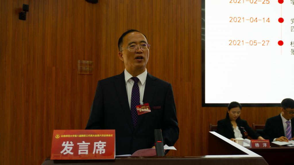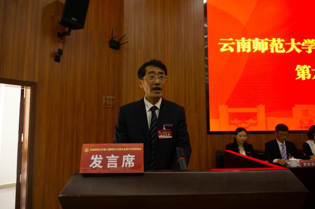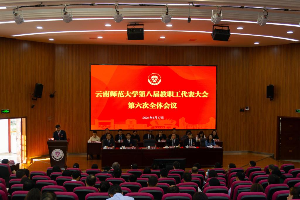 6月17日下午,学校在呈贡校区汇学楼2幢101报告厅召开第八届六次教职工代表大会,审议并原则通过《yL23411永利官网登录建设发展第十四个五年规划和二〇三五年远景目标纲要》(草案)。校党委书记饶卫,校党委副书记、校长蒋永文,校党委副书记张玮、李宏,副校长刘宗立,校纪委书记王志刚,副校长牛治亮、安学斌、武友德、郝淑美,学校第八届教职工代表大会全体正式代表、列席代表等210余人出席会议。大会由校党委副书记、工会主席张玮主持。
