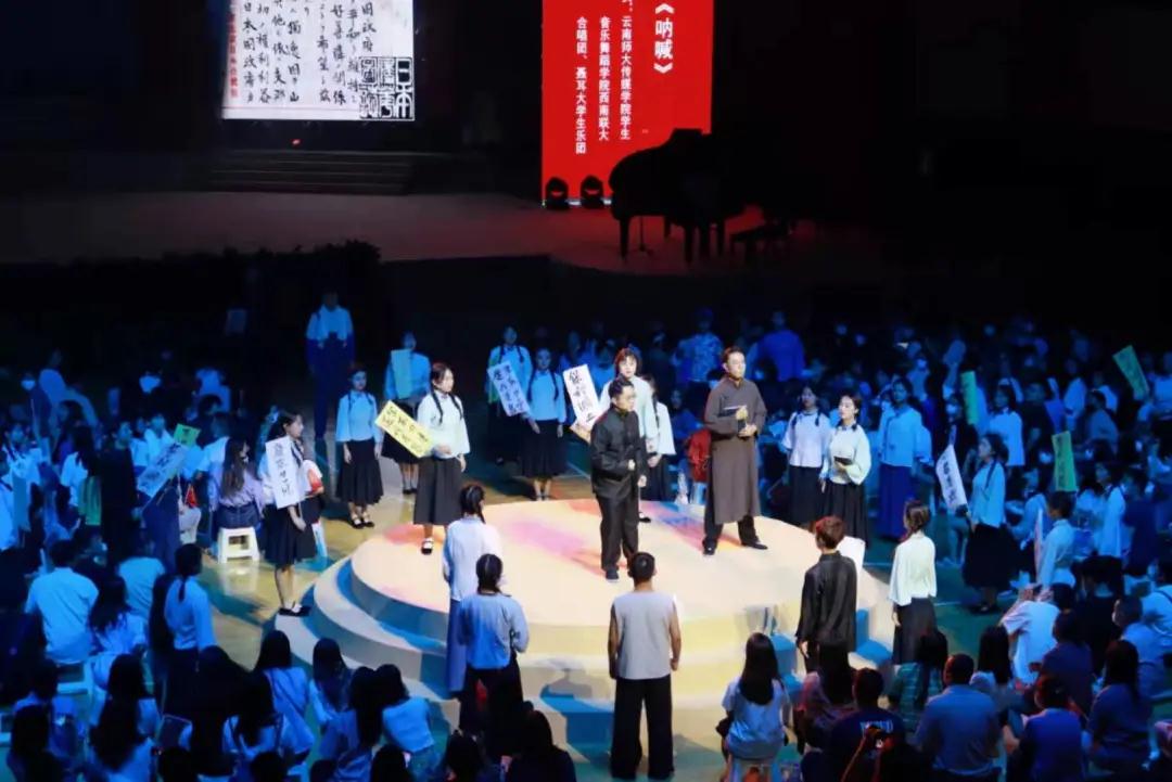 “红烛啊!莫问收获,但问耕耘。”《西南联大组歌》片段《红烛颂》讲述了烽火岁月中,为保存教育的火种,三校师生历经艰辛辗转南迁昆明合组西南联大,在极端艰苦的条件下鼎力治学研究,坚持为国育才的动人场景。西南联大教授闻一多先生拍案而起,发表最后一次演讲,为争取民主与正义献出宝贵生命的故事,让在场师生再次感悟到闻一多先生深沉的赤子情怀。