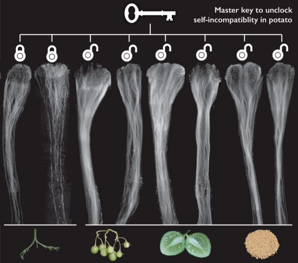 在马铃薯、番茄等茄科植物中,自交亲和性与其携带的SLF (S-locus Fox)蛋白和S-RNase酶的类型密不可分。S-RNase酶是一种细胞毒性蛋白,仅在花柱中特异表达并被分泌到花柱传导组织,是花粉进入雌蕊的“门锁”;仅在花粉中特异表达的SLF蛋白则更像一把“钥匙”,虽然不能识别自身植物的“门锁”,却能识别其他材料的“门锁”,进而通过26S蛋白酶把“门锁”降解,保证了杂交亲和。