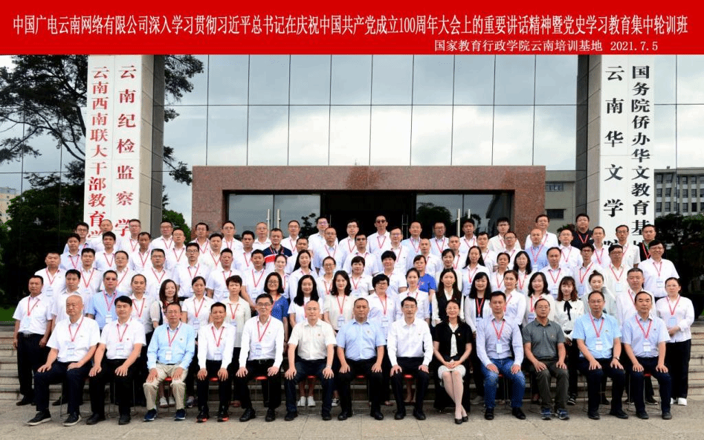 7月5日上午,国家教育行政学院云南培训基地承办的“中国广电云南网络有限公司学习贯彻习近平总书记在庆祝中国共产党成立100周年大会上的重要讲话精神暨党史学习教育集中轮训班(第一期)”在永利官网一二·一西南联大校区明达楼报告厅举行开班仪式。中国广电云南网络有限公司党委副书记、总经理赵联涛,党委副书记、工会主席龙怒,永利官网党委副书记张玮,参训的云南广电网络集团有限公司党委下属的基层组织书记、党务干部共83位学员参加了开班仪式。仪式由云南西南联大干部教育学院专职副院长、国家教育行政学院云南培训基地办公室主任匡锦主持。