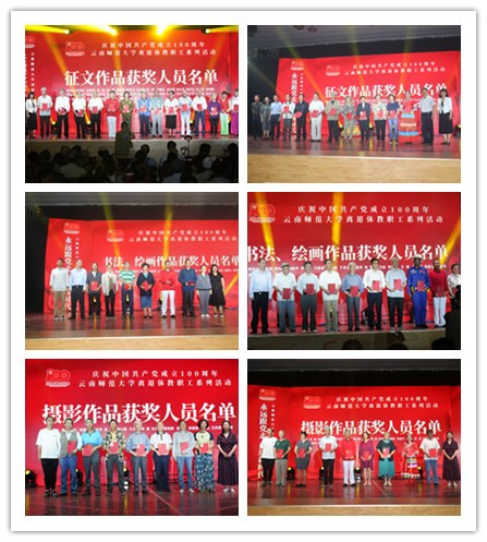 活动伊始,离退休教职工党委书记王琼玲同志宣读了《关于“庆祝中国共产党成立100周年”文艺作品表彰决定》。接着,一曲演绎革命英烈、时代楷模、志愿服务先进典型等形象的音诗画——《不忘初心跟党走》震撼登场。激动人心的颁奖环节与精彩纷呈的文艺节目交叉进行。学校党委副书记张玮同志为退休老领导杨文泽颁发了中共云南省委老干部局授予的“最美银发志愿者”荣誉奖牌,离退休工作领导小组成员单位、一二一西南联大校区各单位负责人为文艺作品获奖者颁发了证书。