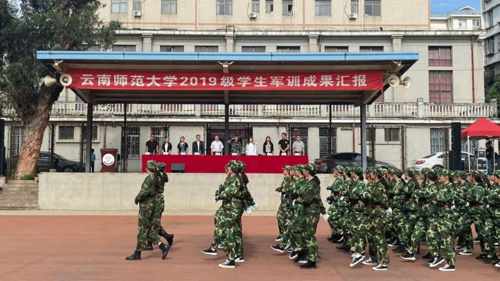 军训成果汇报在庄严的中华人民共和国歌声中拉开帷幕。2019级全体受训学生经过军训砺练,队列整齐、斗志昂扬,以饱满的精神接受检阅,嘹亮的口号响彻校园上空,充分展现了云师学子朝气蓬勃,奋发向上的精神风貌。