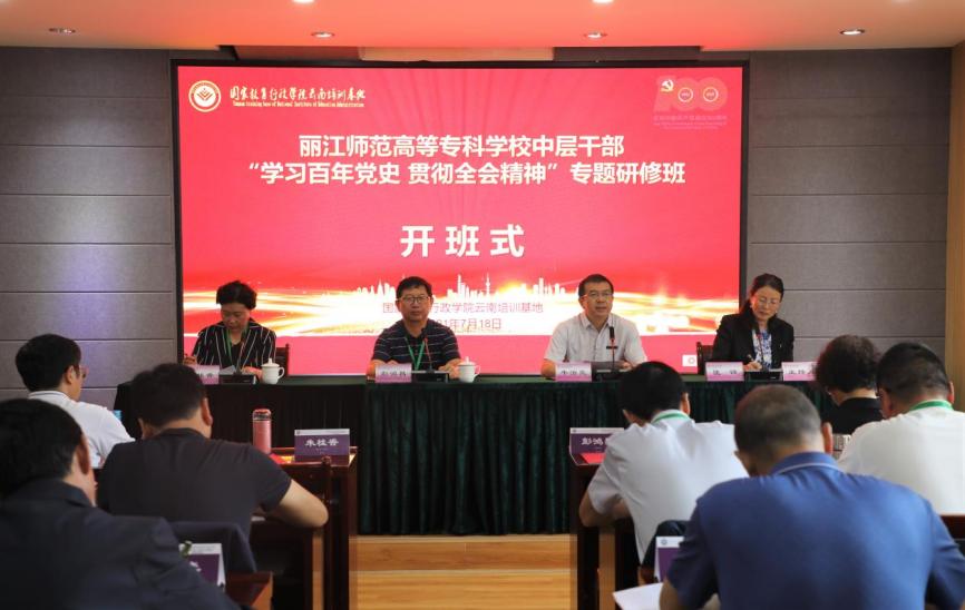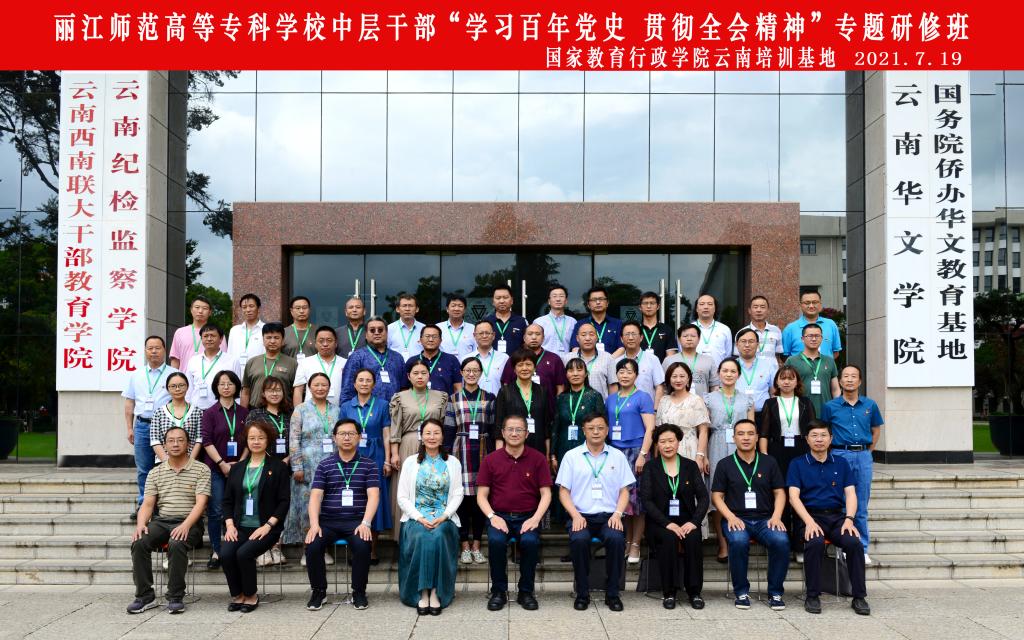 7月18日至22日,丽江师范高等专科学校中层干部“学习百年党史 贯彻全会精神”专题研修班在永利官网一二一联大校区举办,由国家教育行政学院云南培训基地承办。丽江师范高等专科学校党委书记张祖武、校长毕天云带队,全校中层以上干部共51人参加。丽江师范高等专科学校党委副书记彭鸿昌、副校长朱桂香、yL23411永利官网登录副校长牛治亮参加开班仪式,仪式由云南西南联大干部教育学院专职副院长、国家教育行政学院云南培训基地办公室主任匡锦主持。