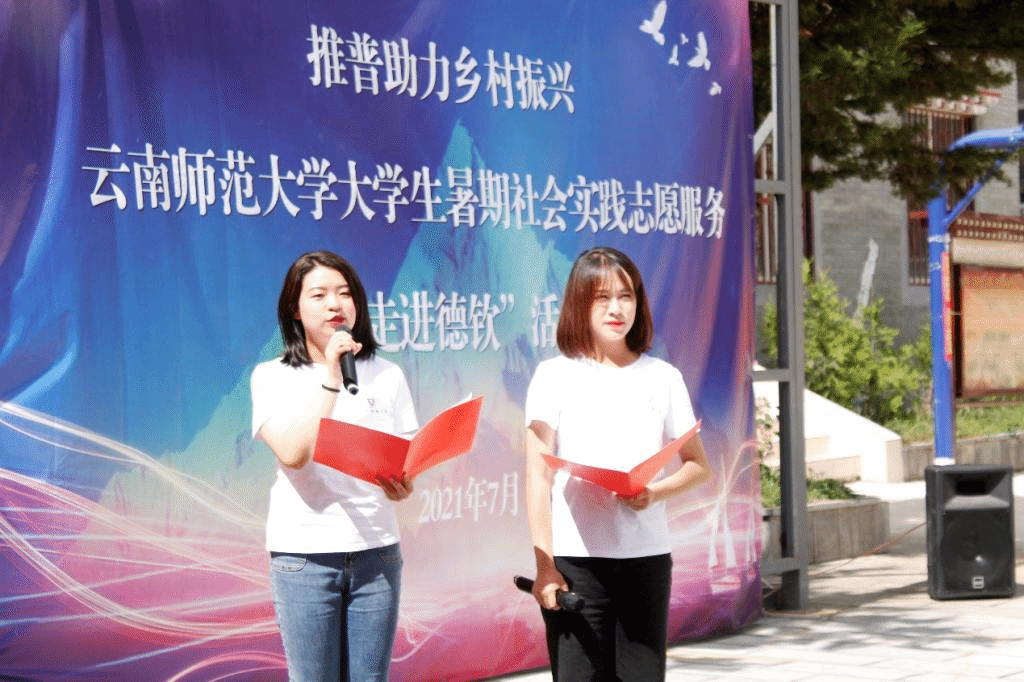 本次志愿服务团队由传媒学院播音主持专业负责人王建陵指导,语言传播系骨干教师谭辉协助带队,播音主持专业为主的12名优秀学生组成。根据德钦县教育局的统筹安排,志愿团队在升平镇敦和社区进行两场普通话诵读节目展演活动,并针对当地群众的普通话认知和运用水平进行了访谈及问卷调查。升平镇敦和社区、阿墩社区、阿东村、巨水村的数百名群众观看了诵读展演。