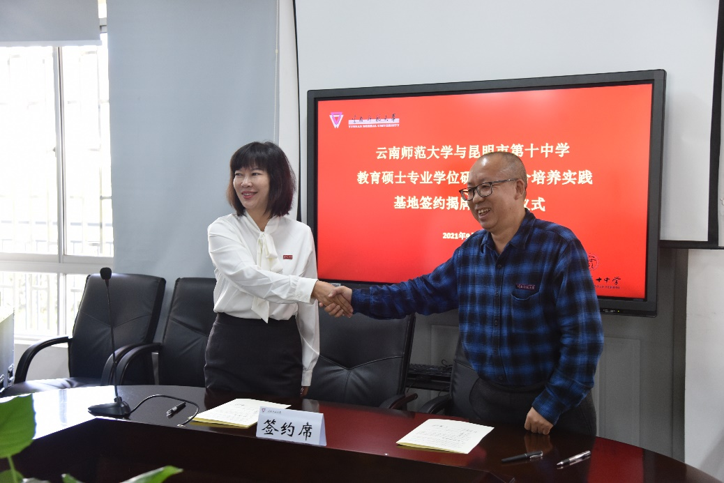 安学斌副校长代表学校致辞,他首先对永利官网与昆明市第十中学教育硕士专业学位研究生联合培养实践基地的签约揭牌表示祝贺,并对昆明市第十中学长期以来给予永利官网教育硕士培养工作的支持和帮助表示衷心的感谢。他指出,教育硕士是研究生教育中一个重要的培养类别,是国家建设高水平基础教育师资队伍、推进基础教育改革的中坚力量,其目标是培养高素质的基础教育学校专任教师和管理人才,其重点是培养研究生的职业能力、实践能力和创新能力。实习实践是教育硕士培养中的重要环节,联合培养实践基地是教育硕士培养不可或缺的平台,昆明市第十中学是一个历史悠久、实力雄厚、社会影响大、发展势头好的基础教育名校,能与这样的名校共建实践基地对于我们教育硕士培养工作意义重大。为此,安学斌副校长要求研究生院与昆明市第十中学加强交流,持续深化合作,把实践基地建设得更好。此外,安学斌副校长对本次当选永利官网研究生导师的27位昆明市第十中学教师表示祝贺,新导师的加入为永利官网研究生导师队伍注入新鲜血液,他希望新聘导师能够按照学校研究生导师队伍的建设要求,加强学习、提高素质,认真履行导师职责,共同努力把教育硕士培养工作做好。最后,安学斌副校长对到昆明市第十中学实习的25名教育硕士表达了殷切的期望,希望他们能珍惜来名校实习的机会,认真学习,虚心求教,好好打磨教学技能,不断提高本领,为祖国的教育事业做出自己的贡献。