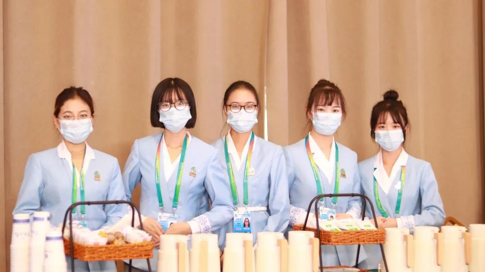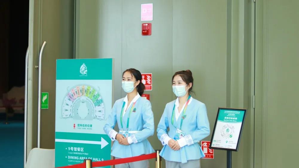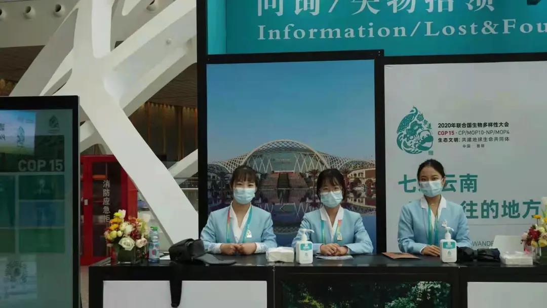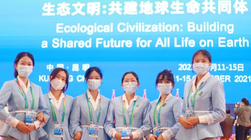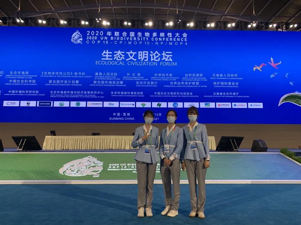 COP15大会期间,永利官网学生志愿者和教师工作人员70余名,在公约秘书处蓝区、安检口语言翻译、安检现场翻译、冷餐会及餐饮服务、南序厅、志愿者工作部等岗位开展志愿服务。