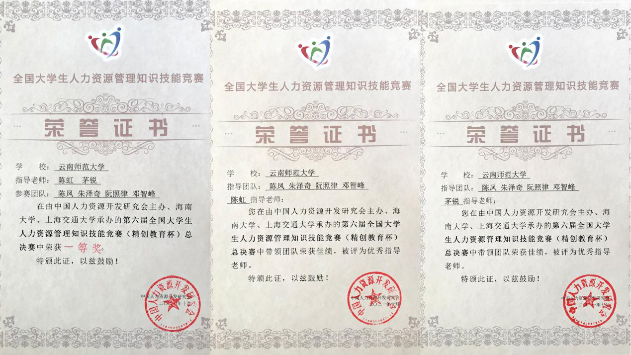 10月23日至24日,由中国人力资源开发研究会大学生知识技能竞赛理事会主办、海南大学和上海交通大学联合承办的第六届全国大学生人力资源管理知识技能竞赛(精创教育杯)总决赛暨高峰论坛在海南大学举行。此次决赛共有来自上海交通大学、河南大学、苏州大学等71所院校的284名参赛选手参赛。永利官网教育学部党委副书记朱静虹、公共事业管理系系主任字疆燕带队,教师陈虹、茅锐指导的应用心理学和公共事业管理专业本科生组成的代表队经过激烈角逐斩获一等奖,陈虹、茅锐老师两位老师荣获优秀指导教师。