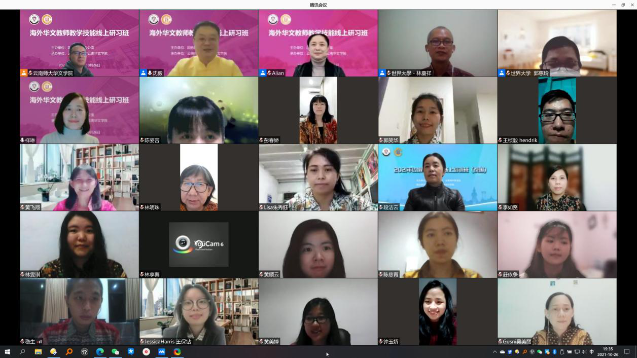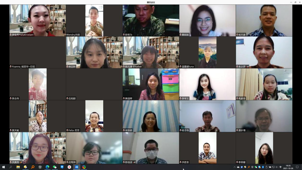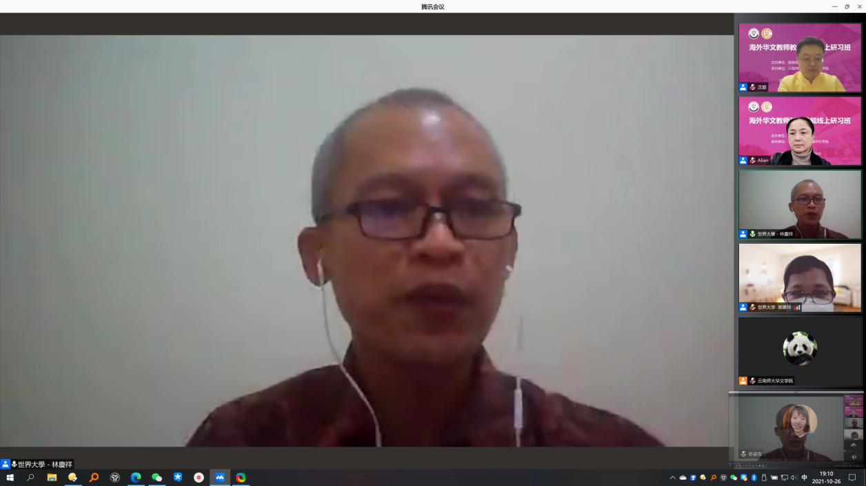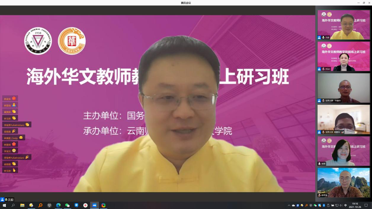 10月26日,由国务院侨务办公室主办、yL23411永利官网登录云南华文学院承办的2021年海外华文教师教学技能线上研习班结业仪式在线上顺利举行。印度尼西亚世界大学林庆祥副校长,云南华文学院和雪莲书记、王秀成院长以及学院相关领导出席,来自印度尼西亚16个省、68所学校的参训华文教师参加了结业仪式,仪式由yL23411永利官网登录汉推基地常务副主任沈毅教授主持。
