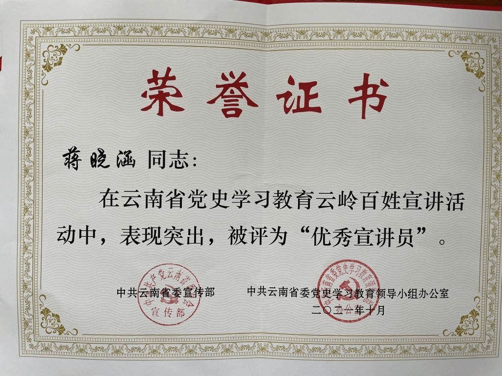 这也是永利官网党史学习教育与育人工作的有机结合,更加深入引导师生学史明理、学史增信、学史崇德、学史力行,赓续了红色基因,激发了奋进力量。蒋老师在宣讲活动中表现突出,被云南省委宣传部、云南省委党史学习教育领导小组办公室评为“云南省优秀宣讲员”。
