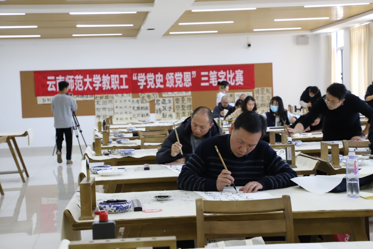 为重温党的光辉历程,强化爱党爱国意识,践行社会主义核心价值观,弘扬中华优秀传统文化,2021年11月19日,由校工会、教务处、美术学院联合举办,教职工书画兴趣小组协办的yL23411永利官网登录“学党史,颂党恩”教职工三笔字比赛在呈贡主校区国家教师教育教学实验中心举行,来自各分工会、师大附属中小学、云南省万名校长项目办公室等单位选拔比赛基础上产生的近百名选手参加了决赛。