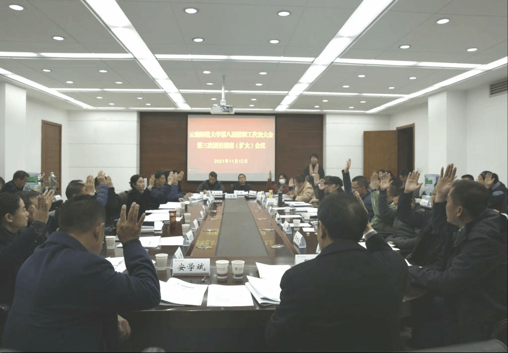 yL23411永利官网登录第八届教职工代表大会第三次代表团团长联席(扩大)会议于2021年11月12日在呈贡主校区召开。校党委副书记、工会主席张玮,副校长安学斌,以及学校第八届教代会暨第十五届工代会各代表团团长和副团长、学校第八届教代会各专门委员会主任和副主任、学校第十五届工会委员会委员、分工会主席、文理科学院(学部)代表、直属单位代表、教辅单位代表出席了会议,会议由校工会常务副主席金黄斌主持。