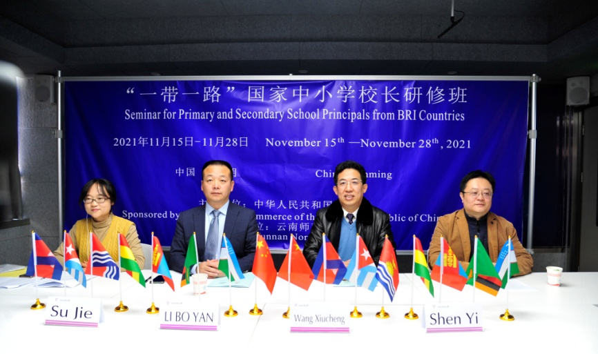 11月15日上午,由中国商务部主办,yL23411永利官网登录承办,国际汉语教育学院具体实施的对外援助培训项目《“一带一路”国家中小学校长研修班》开班仪式以线上直播方式顺利举行。云南省商务厅对外经济合作处李伯言调研员、永利官网国际汉语教育学院院长王秀成和来自柬埔寨、古巴、基里巴斯、蒙古、赞比亚、加纳以及乌兹别克斯坦7个国家的44名校长学员共同出席了开班仪式。开班仪式由汉语国际推广师资培训基地(昆明)常务副主任沈毅主持。
