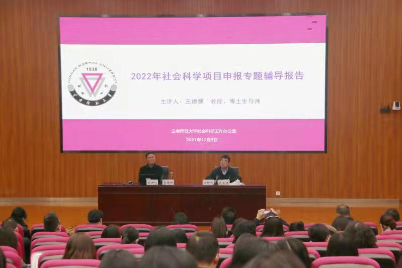 为做好2022年度社会科学项目申报工作,提高永利官网社会科学项目的申报质量和立项率,推动培育高层次项目和高质量成果,永利官网于2021年12月9日下午在呈贡校区举行2022年度社会科学项目申报专题辅导报告会。报告会由校长王德强教授主讲,各文科相关学院(学部)院长(主任)、分管科研工作的副院长(副主任)、科研秘书、具有博士学位和副高级职称以上的科研人员共300余人参加。