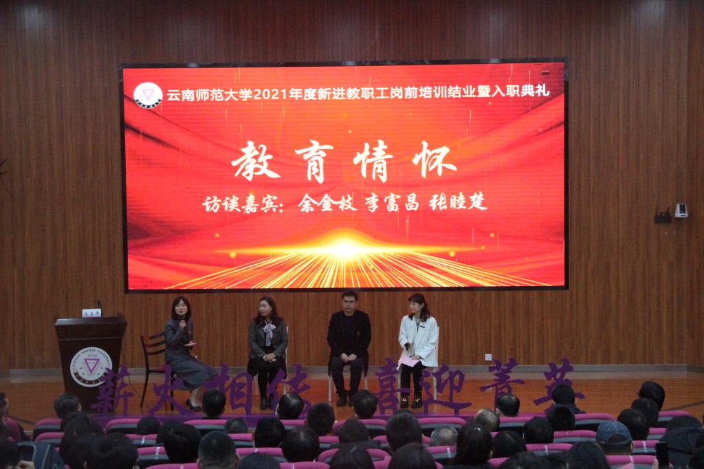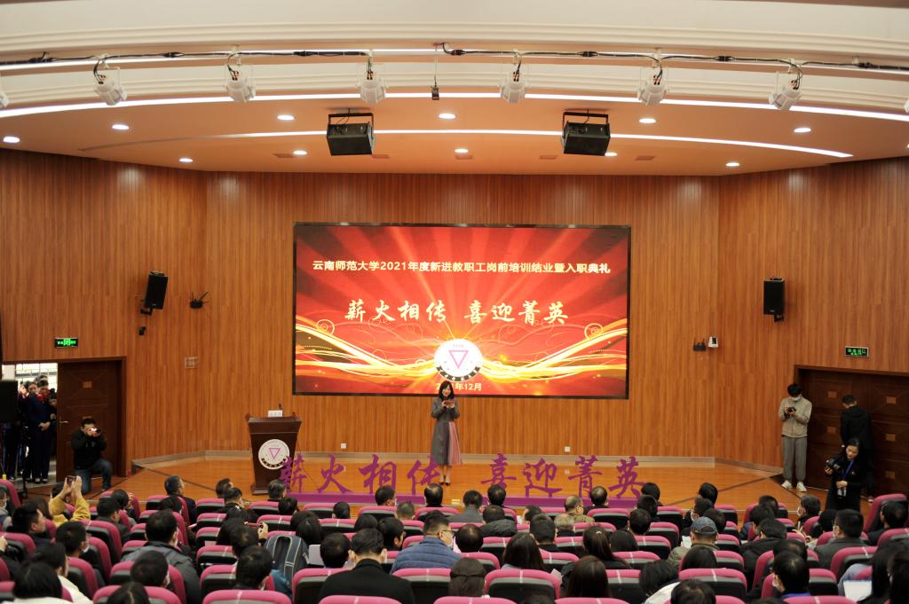12月17日下午,学校2021年度新进教职工岗前培训结业暨入职典礼在呈贡主校区汇学楼2幢101报告厅顺利举行。校党委书记蒋永文、校长王德强,校党委副书记张玮、李宏,副校长牛治亮、安学斌、武友德、蔡金红、甘健侯,相关单位主要负责人及新进教职工等220余人参加了典礼。
