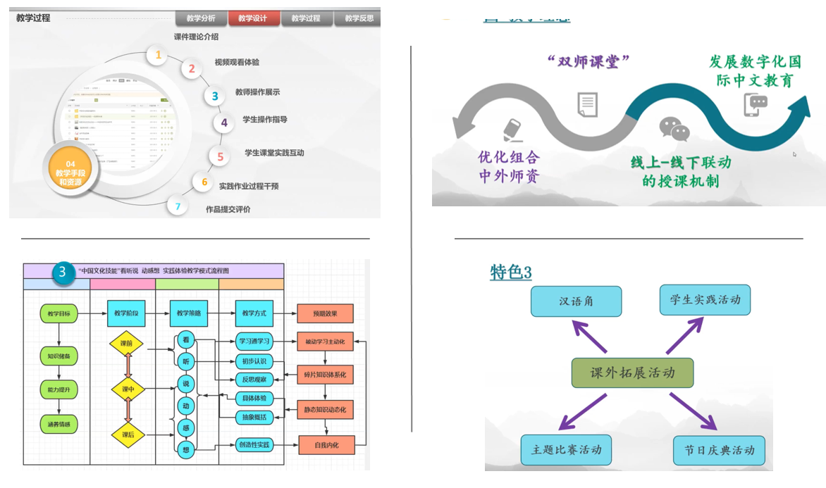 重庆大学结合奥运会比赛视频,将课程与国情、文化、教育相结合,充分体现了中国元素与中国力量。西南大学聚焦汉字教学,有机融合汉字的形体架构与文化含义,有效降低了学生识记汉字的难度。yL23411永利官网登录以BOPPPS理念为统领,帮助学生加深对当代中国和地方文化的了解,带来“语言+文化+国情”融合型中文课。西南交通大学自制中外青年云对话视频教学资源,以国际视角展现当代中国,为各国青年打开了解中国的窗口。贵州大学以任务型教学法+实践教学的教学理念,进行“有字句”“在字句”教学。四川外国语大学以“中俄双师课堂”的教学理念为指导思想,实现用中文对中国画与油画进行简单比较。四川师范大学、贵州财经大学以中、外汉硕研究生为授课教师,以3P教学法为指引,运用任务型教学法进行“被字句”教学。大理大学通过“结构—功能”相结合的方式,展开初级综合课教学。红河学院采用“课件理论介绍+视频观看体验+教师操作展示+学生操作指导+学生课堂实践互动+实践作业过程干预+作品提交评价”的模式开展线上线下古琴体验文化教学。重庆师范大学根据多模态角色扮演理论,通过线上线下相结合的方式,进行汉语日常表达教学及操练。昆明理工大学从“科技汉语”出发,帮助学生掌握数学图形关系在汉语中的表达。西南科技大学以精讲多练,循序渐进“做中学”为理念,在功夫扇“体验式”教学中展开“把字句”教学活动。云南大学通过“创设语境,以练带讲”为根本,进行中级汉语词汇辨析与教学。