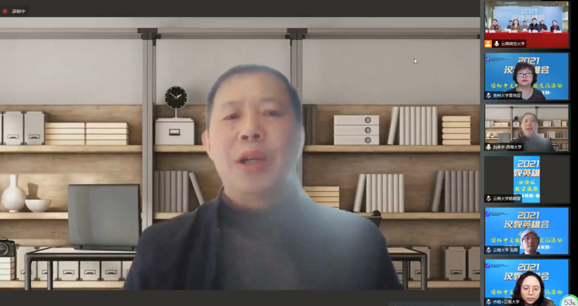 西南大学国际学院院长刘承宇教授代表西南区院校致辞,表达了对主办方及承办方的感谢。他表示举办汉教英雄会,是一场西南区各院校齐聚云端,共研新时代国际中文教育理念与实践的交流盛宴。西南区的教学作品精彩纷呈,既有关注汉语本体知识技能教学及运用的优秀案例,也有聚焦“汉语+”的创新探索;既有运用讲授法、听说法、交际法等经典教学方法的成功案例,也有运用体验式、探究式、合作教学等创新教学方法的大胆尝试,相信西南区国际中文教育事业将在各院校共同努力下迈上新台阶。