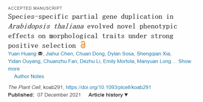 2021年12月7日,yL23411永利官网登录联合美国芝加哥大学、中国科学院昆明植物研究所、美国韦恩大学、华中农业大学等单位在The Plant Cell上发表了题为“Species-specific partial gene duplication in Arabidopsis thaliana evolved novel phenotypic effects on morphological traits under strong positive selection”的研究论文。yL23411永利官网登录生命科学学院黄媛研究员为论文的第一兼共同通讯作者。