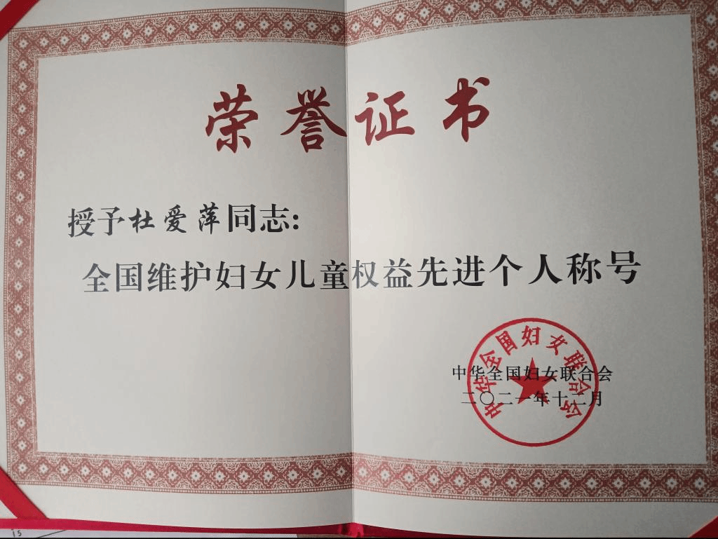 为表扬先进、树立榜样,弘扬社会主义法治精神和社会主义核心价值观,推动妇女儿童权益保护工作,2021年全国妇联决定授予796个单位全国维护妇女儿童权益先进集体称号,授予798名同志全国维护妇女儿童权益先进个人称号。全国维护妇女儿童权益先进表彰项目每两年举办一次,本次全国妇联表彰了全国在维护妇女儿童权益方面表现突出的单位和个人,主要来自基层公检法司、教育、民政、工青妇等人民团体。他们在平时的工作中,爱岗敬业,在维护妇女儿童权益方面作出了突出贡献。永利官网法学与社会学学院杜爱萍喜获“全国维护妇女儿童权益先进个人”殊荣。