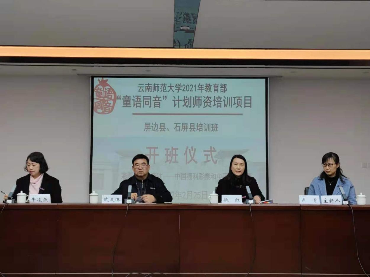 开班仪式上,武友德副校长致辞,指出本次培训是贯彻落实全国语言文字会议部署,加强学前儿童普通话教育,助力乡村振兴战略,服务铸牢中华民族共同体意识的一项重要工作。他相信通过培训,将有力助推屏边县、石屏县幼儿园建设一支热爱中华优秀传统文化、国家通用语言文字应用水平较高、对学前儿童普通话教学具有示范带动作用的教师队伍。