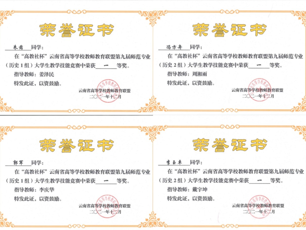 近日,“高教社杯”云南省高等学校教师教育联盟第九届师范专业大学生教学技能竞赛结果揭晓,在备赛小组全体师生的共同努力下,历史与行政学院师生包揽了本次历史学科教学技能竞赛全部一等奖。“高教社杯”云南省高等学校教师教育联盟师范专业(历史学科)大学生教学技能竞赛时隔五年后再次举办。继2016年联盟教学斩获全部一等奖(4项)之后,永利官网学生再次将全部一等奖(4项)收入囊中,同时还获得2项二等奖,1项三等奖。
