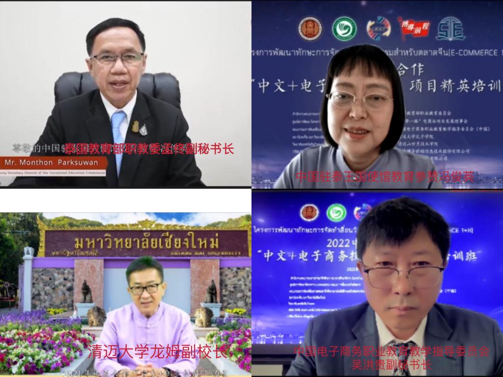 2022年3月14日,2022年中泰合作“中文+电子商务技能”项目精英培训班于泰国清迈大学学术中心正式开班。永利官网郝淑美副校长、泰国教育部职业教育委员会孟佟•帕素万(Mr.Monthon Parksuwan)副秘书长、中国驻泰国大使馆冯俊英参赞、中国电子商务职业教育教学指导委员会陆春阳副主任、清迈大学龙姆副校长、北京博导前程信息技术股份有限公司段建董事长、清迈大学孔子学院中泰方院长等领导和来自中泰院校教师、参训学生以及企业代表近100人共同出席开班仪式。
