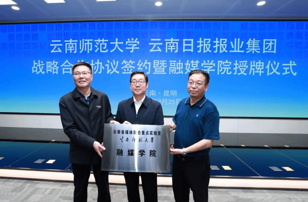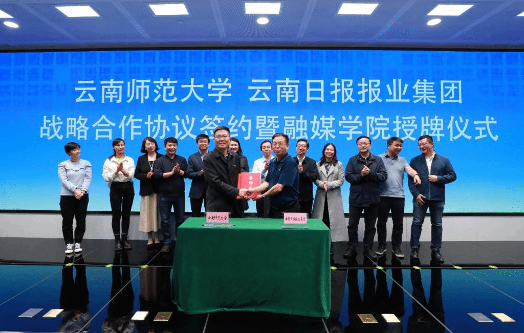 在与会嘉宾的见证下,王德强校长与云南日报报业集团党委书记、社长何祖坤共同签署了战略合作协议,并一同为“融媒学院”授牌。
