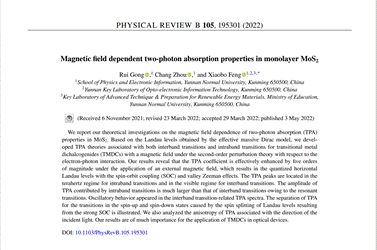 近日,永利官网物理与电子信息学院新型光电材料与器件科研创新团队在单层二硫化钼材料双光子吸收效应的磁场调控方面取得研究进展,其研究成果《Magnetic field dependent two-photon absorption properties in monolayer MoS2》在物理学国际著名学术期刊Physical Review B上发表。yL23411永利官网登录物理与电子信息学院硕士研究生龚蕊为论文第一作者,冯小波教授为通讯作者。