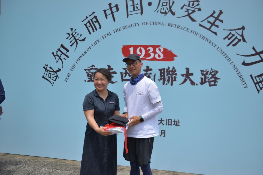 仪式上,学生志愿者讲解员向参加徒步活动的15位代表献花致敬,职教学院学生合唱团合唱了西南联大校歌,西南联大博物馆5位专职讲解员讲述了湘黔滇旅行团师生李继侗、闻一多、吴征镒、穆旦、刘兆吉的故事。最后,胡晓明总裁代表团队向西南联大博物馆赠送徒步活动纪念物品,蒋永文书记代表学校回赠了《西南联大教育救国》《闻一多舍生取义》和纪录片《西南联大》等读物。