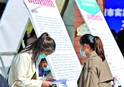 在甘肃省张掖市举办的大中城市联合招聘高校毕业生专场招聘活动现场,大学生在了解岗位信息。王将摄/光明图片