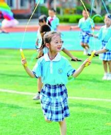 湖南长沙市天心区仰天湖桂花坪小学二年级的学生在体育课上跳绳。新华社发