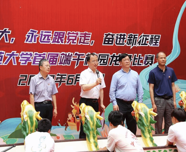 随后,校党委蒋永文书记宣布比赛开幕。观赛领导、老师、同学到北潭观看龙舟比赛。发令枪响后,比赛开始,北潭湖面浪花飞溅,在铿锵有力、节奏鲜明的号子声、鼓点声中,两支参赛队的数十名选手一同乘风逐浪、击水奋楫。